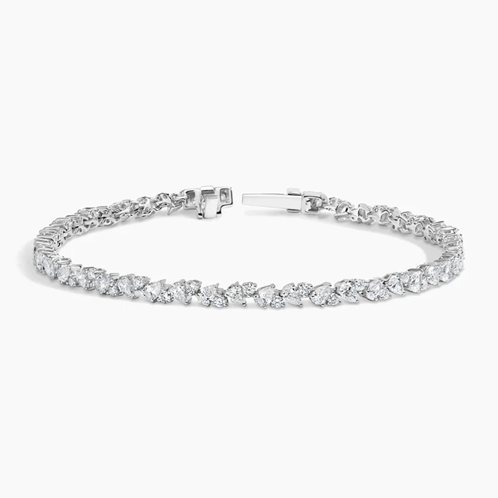 Elevate your style with this Elegant Sterling Silver Leaf-Cut CZ Tennis Bracelet. Featuring a continuous row of sparkling, leaf-shaped cubic zirconia stones set in high-polish sterling silver, this bracelet adds a touch of sophistication to any outfit. The secure clasp ensures a comfortable fit, making it perfect for both everyday wear and special occasions.