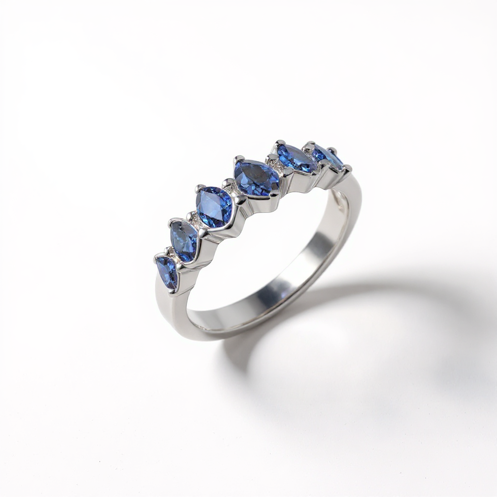 Elegant sterling silver ring featuring five pear-cut blue sapphires. Perfect for any occasion.